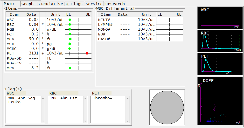 Notice that platelets (PLT) are highly concentrated and the red blood cell (RBC) and leukocyte counts are very low in the second photo.